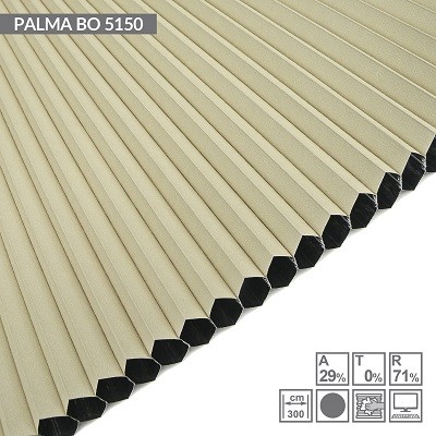 est un tissu opaque dont la face intérieure est décorative et la face extérieure est blanche. L'intérieur du nid d'abeille est recouvert d'un film aluminisé stop soleil et anti-chaleur (couleur gris aluminium).